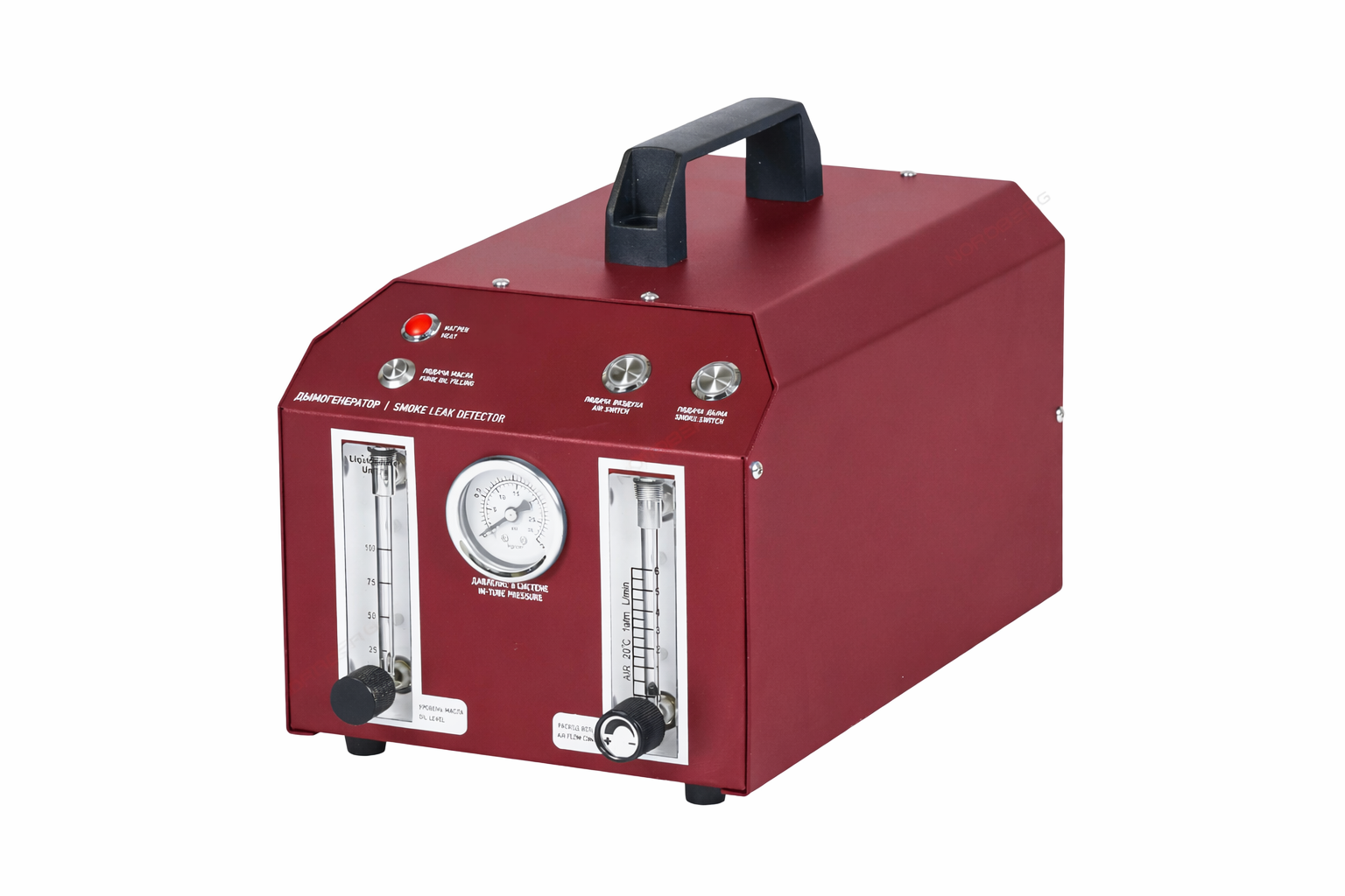 The device heats smoke fluid into a gaseous state, after which a built-in pump compresses the white smoke and delivers it under pressure (1.6–3 bar) into a sealed system.
